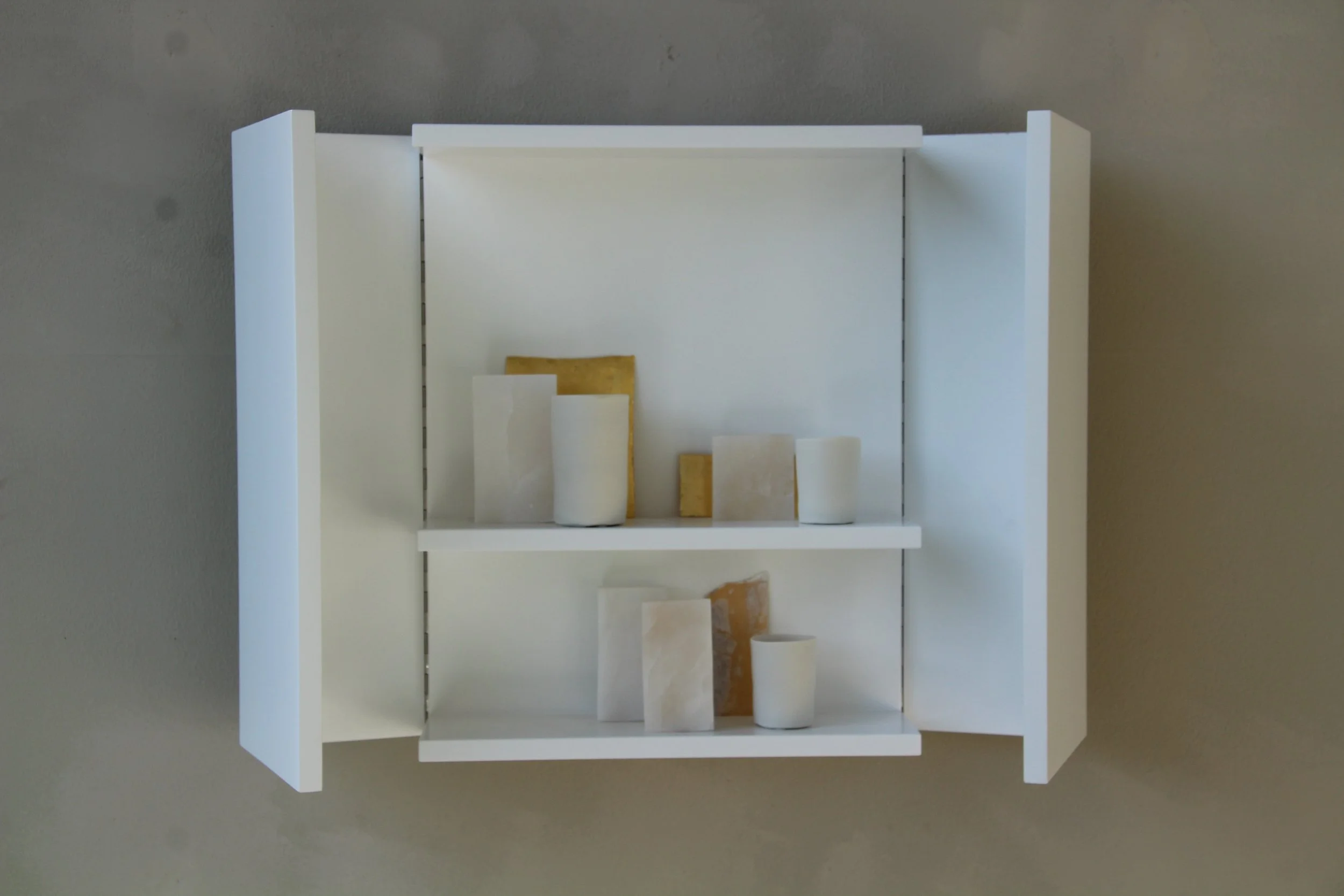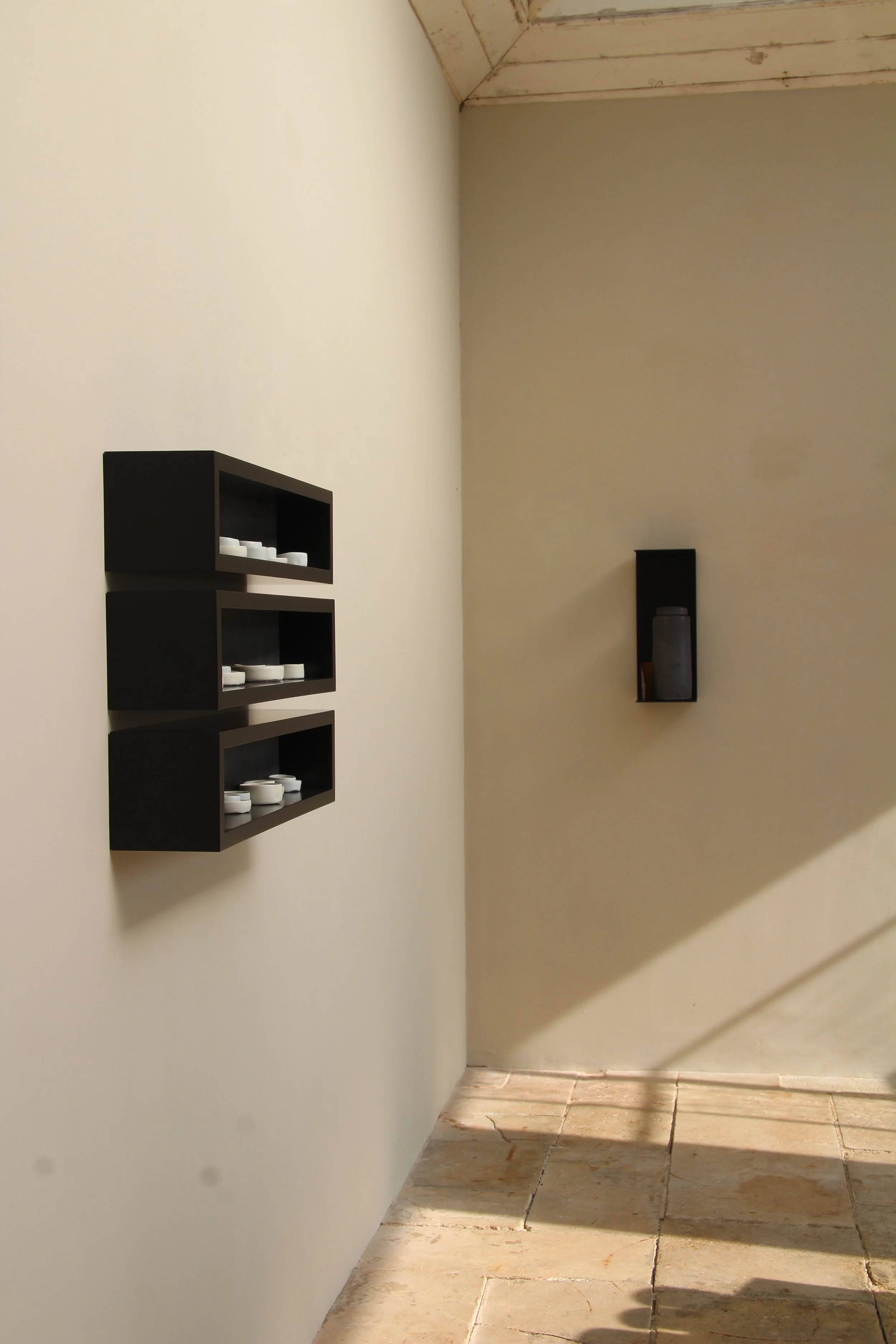 De Waal’s ceramics are suspended on the walls of the Gallery and Orangery. Delicate porcelain vessels, hand thrown by the artist, are accompanied by thin fragments wrapped in gold and small blocks of alabaster. The lightness of the vessels is echoed in the way de Waal’s shelf structures seem to float weightlessly above the ground.