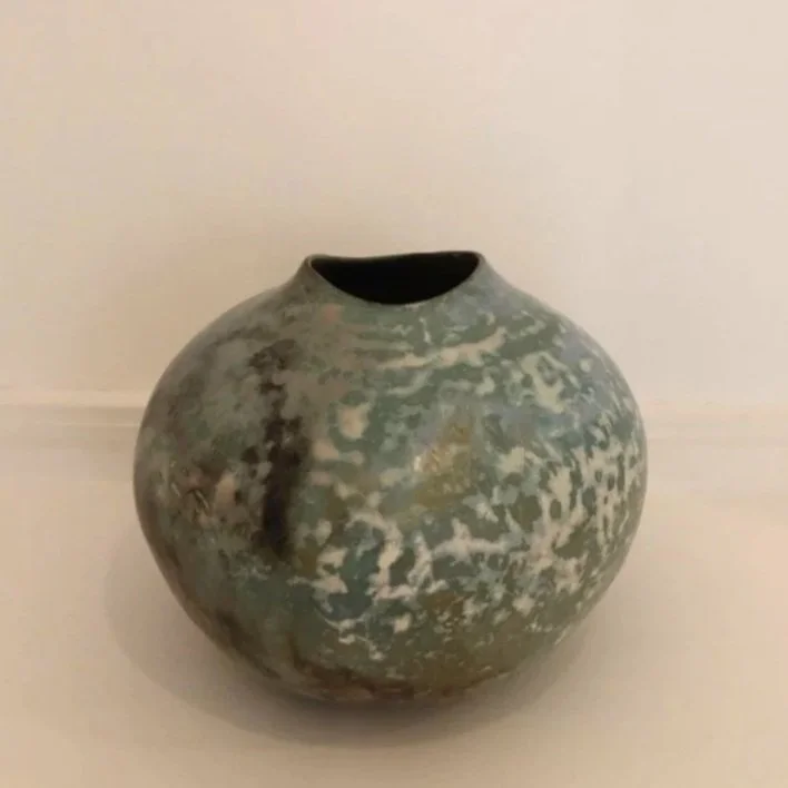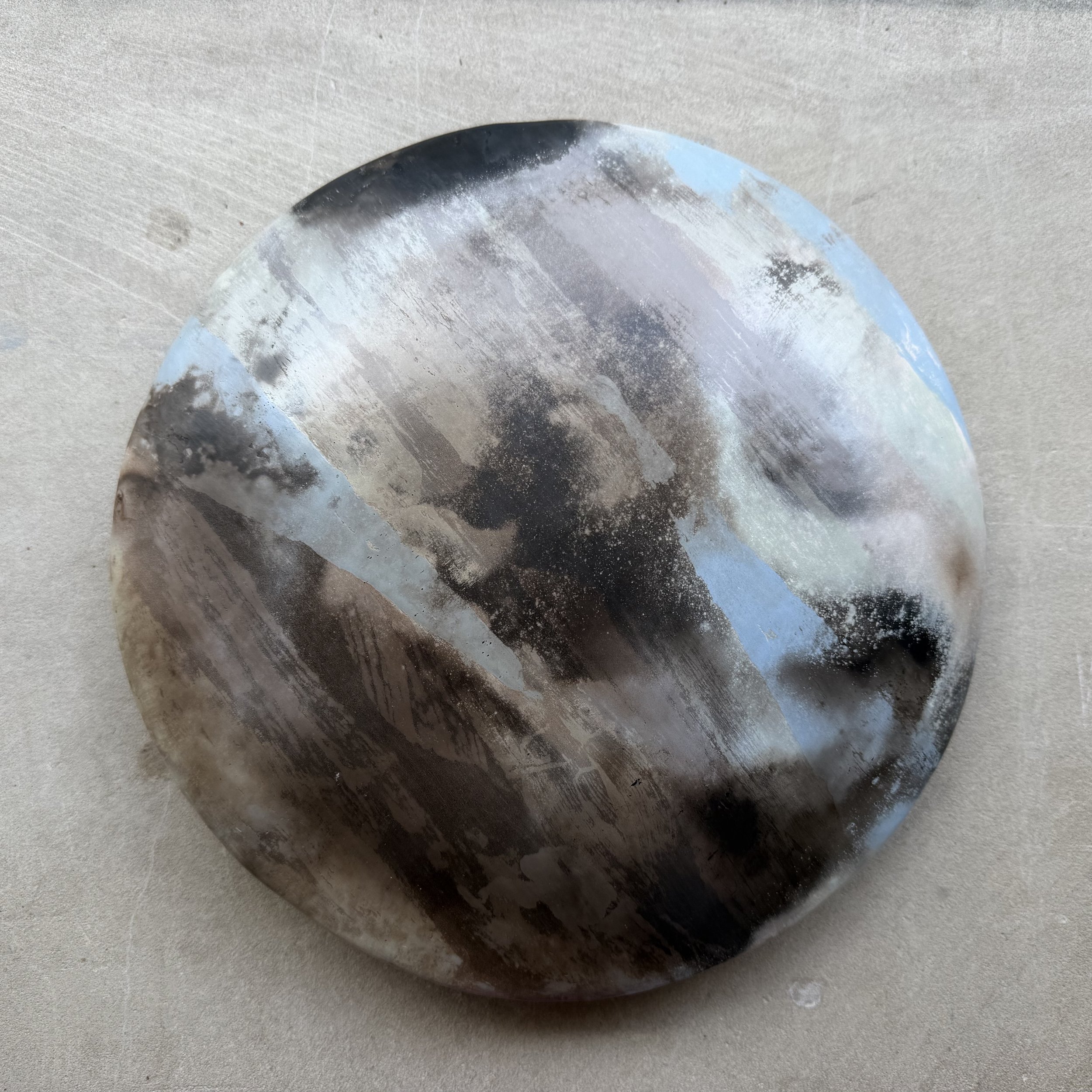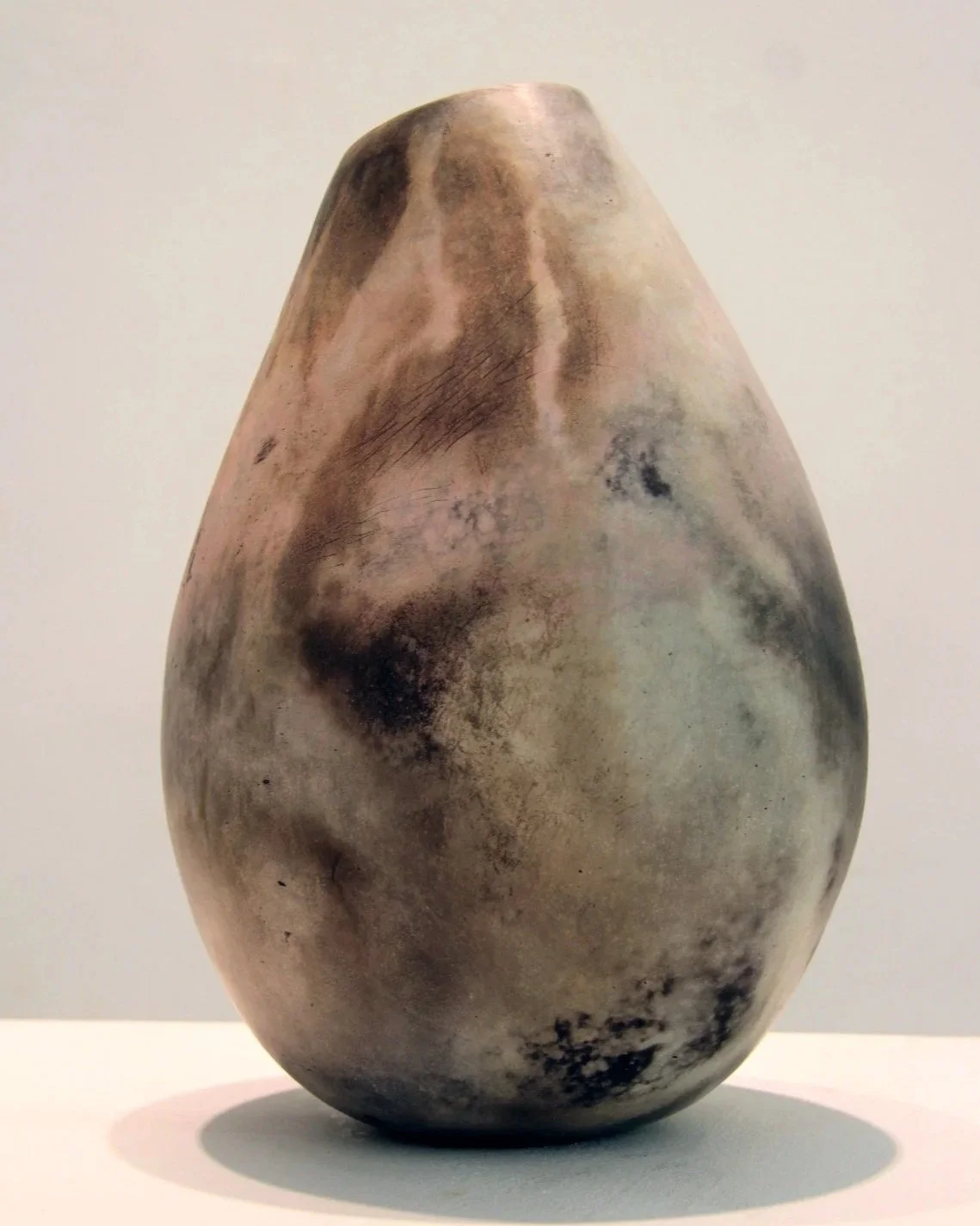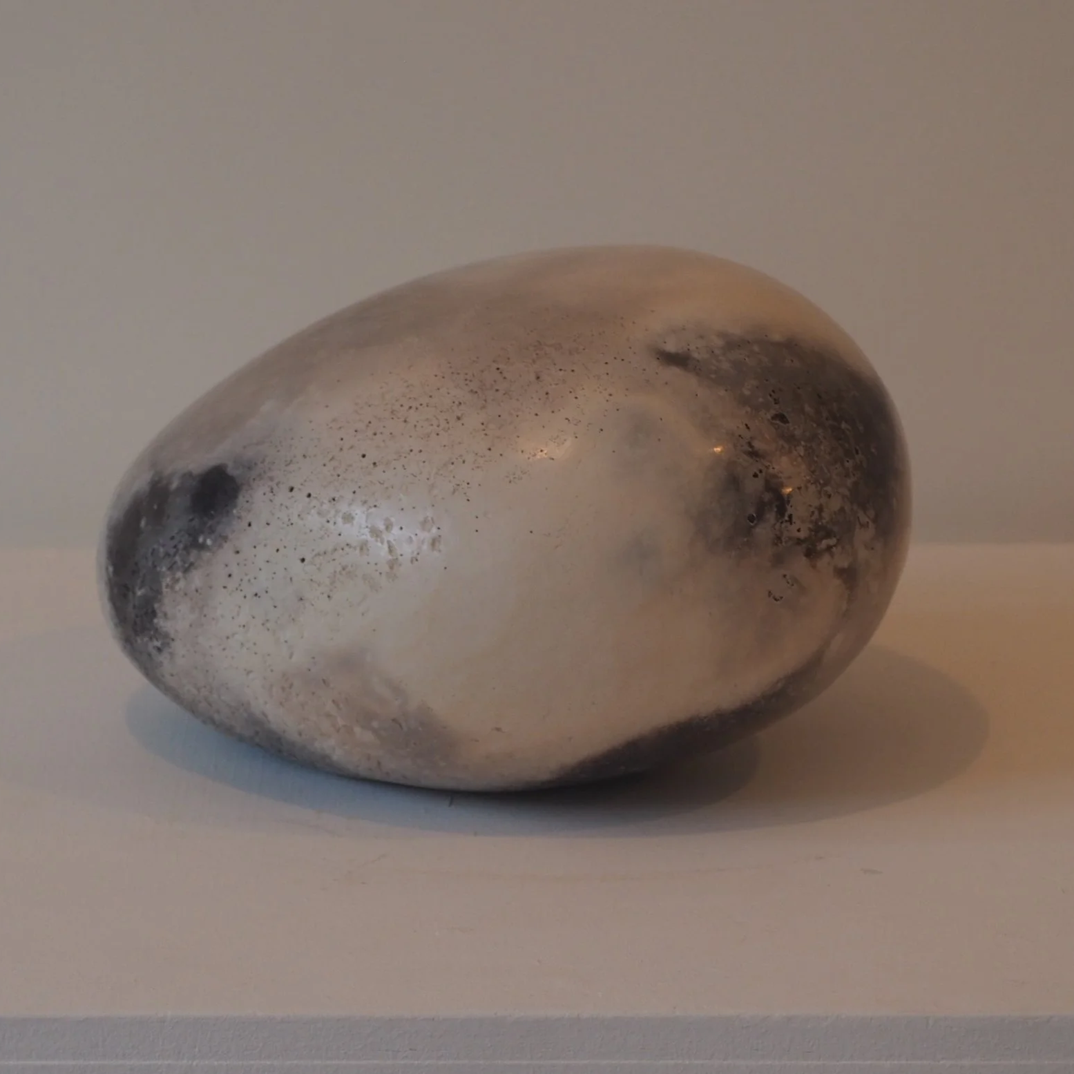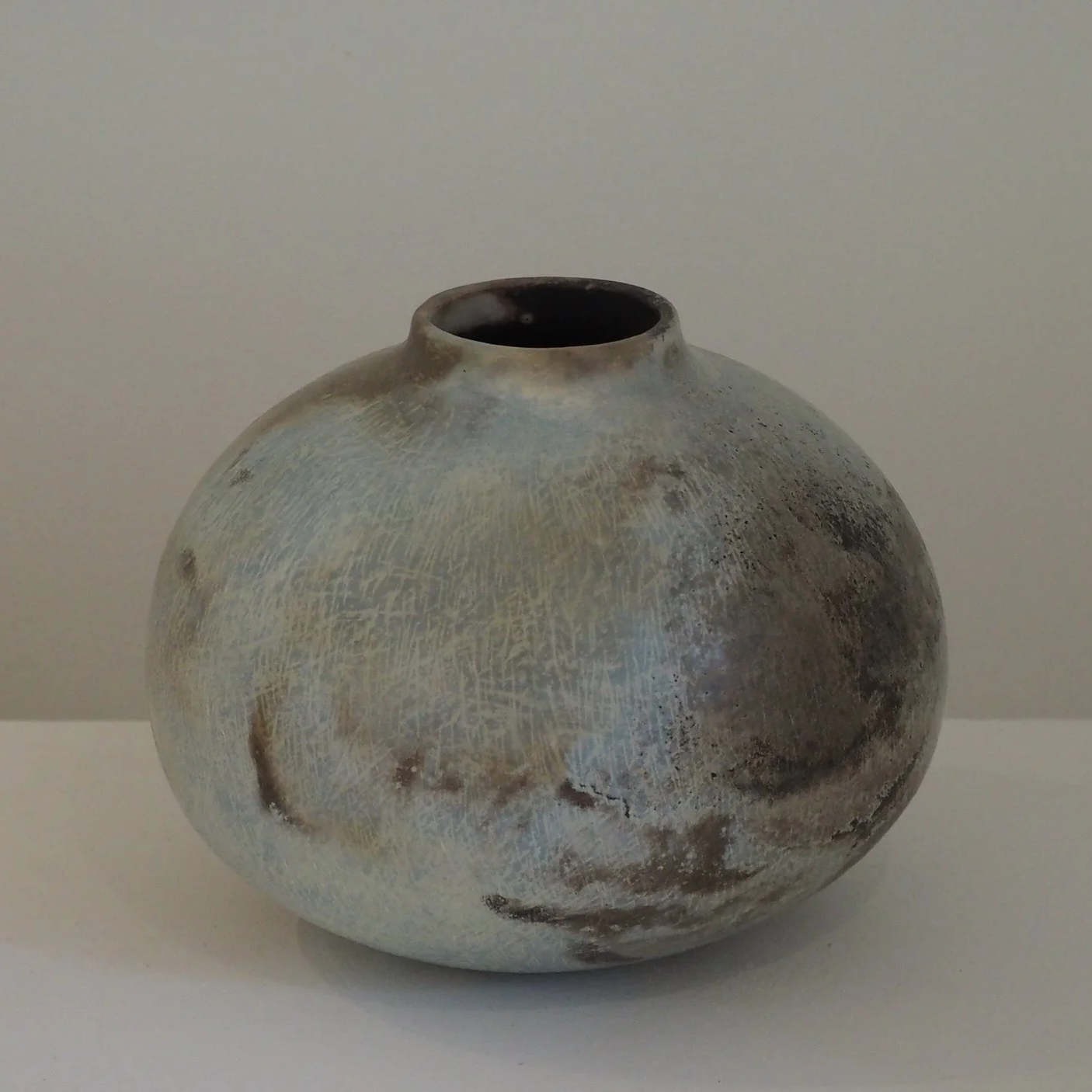 Salisbury-based artist Frances Marr creates works that are rooted in the environment. Drawing on memories of growing up on the Isle of Wight, she takes inspiration from the coasts of the UK, battered by the elements, and the open landscapes of Cumbria. Marr's vessels are smoke fired, where the clay has no glaze but takes on markings during the firing process. The smoke leaves carbonised shadows, emulating foreboding mists and dark, shifting skies.