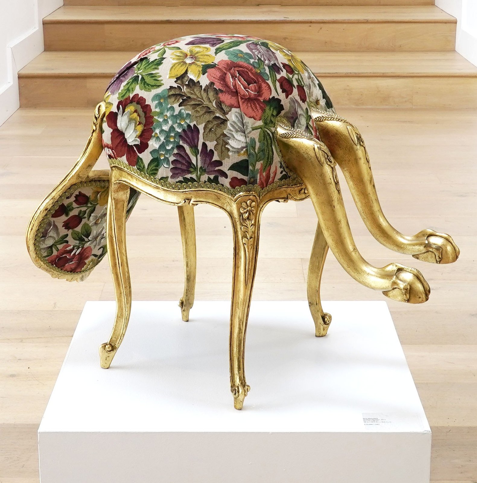 In all elements of this sculpture, the attention to detail effectuates a hopeful resilience. The floral upholstery is reminiscent of new life and beginnings. The hand-carved chair legs were found in a box after the Second World War, by the son of a carpenter. Though old, Saunders found the legs to be surprisingly strong, and she pasted them in gold leaf, celebrating their craftsmanship and gilding them as a beacon of tenacity. Through this metamorphosis, the chair is rendered entirely unique; altered, flexible and powerful - it is the work of generations. The sculpture is a celebration of the time and devotion invested by makers, be they Mothers, carvers or craftspeople, Endless Devotion is a testament to the unwavering strength of humanity.