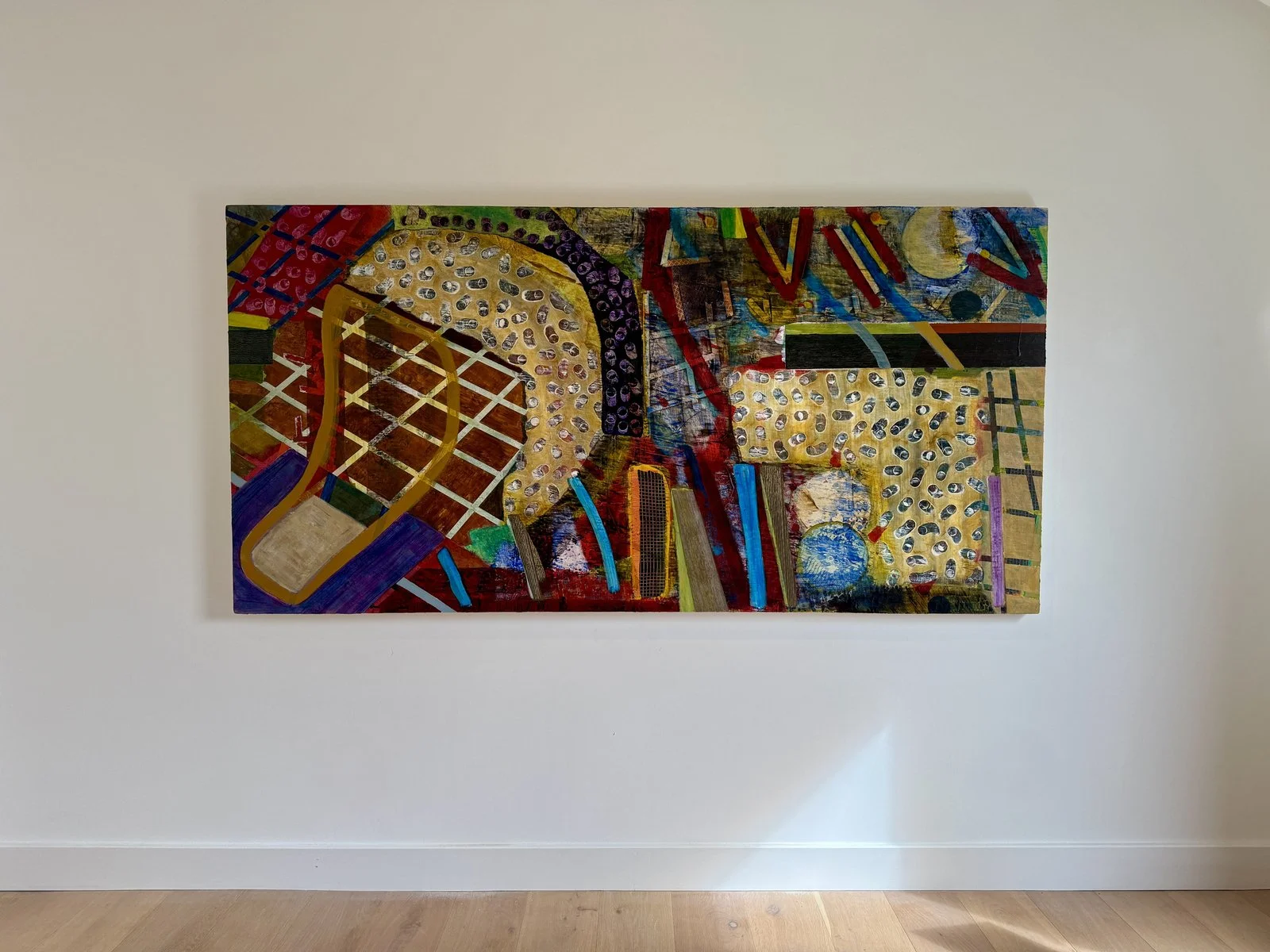 We may view the work of Philip Medley through the lens of abstract expressionism. Through colour and a series of images, which he refers to as his 'visual alphabet', Medley engages in a conversation with his canvas, working intuitively and guided by feeling rather than a predetermined image. This allows for motifs to arise; his paintings are, on reflection, thematically tied, allowing for a harmony across his work. 'The activity of painting can often be spontaneous and sometimes gradual, I am content to accept both transitions of time, as a form of visual meditation.' (Philip Medley). The painting's title, Postcard to Murillo is, like all of his titles, a personal reference. An acknowledgement to his parents and children, snippets of colloquial language from authors and songwriters, and 'the occasional moment of clarity from myself', make up the names of his work. Tying these abstract images to people and places, we may equate Medley's work to a visual diary of his life.