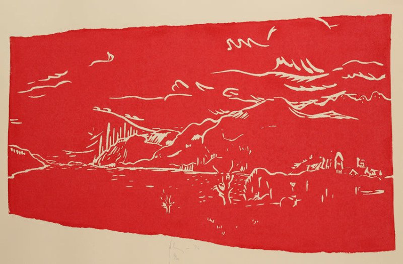 The New Art Centre is home to a selection of Barry Flanagan Linocuts. From bronze, anthropomorphic figures of hares, to abstract compositions of cloth and rope; Flanagan explored the depths of each medium he encountered with relish. The same can only be said for his Linocuts, of which The Abbey, Stones and Herring Drifter at Fort Augustus, were commissioned by Bernard Jacobson Gallery, and were made during a visit to Loch Ness. Whilst there, Flanagan attended a mass at the Abbey at Fort Augustus. 'He has said that the red colour of this print was inspired by the vestments of priests at the service' (conversation with Jeremy Lewison of the Tate Gallery on 21 August 1985)