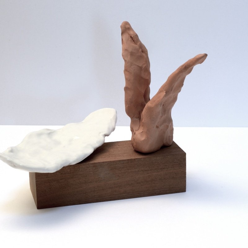 There is an Italian term, ‘due palmi’ to describe the height of a sculpture, as a means of measurement. It means ‘two hands’. The same two hands at the centre of David Ward's recent exhibition: Touching Light are the two hands that made these terracotta and porcelain pieces. We can see the evidence of the makers hands pressed into the sculpture. As such, Ward named the piece Due palmi for the two hands that are simultaneously the creator and the creation. Inspired by Belini's angels, also described as 'due palmi', the terracotta sculpture evokes the image of wings and flight.