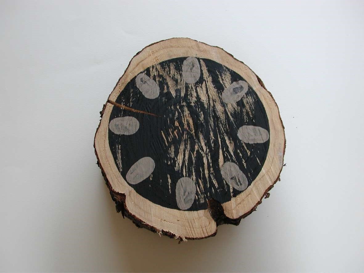 Each fingerprint work, sometimes applied directly onto the wall, sometimes on natural materials like driftwood and handmade paper, is executed both spontaneously and with a great deal of care over the rhythmic and meditative patterning. For Long, these works are analogous to drawing, providing a direct and natural means of recording.