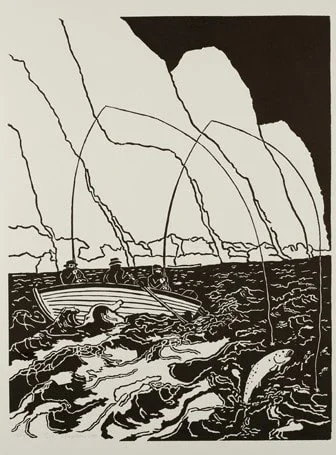 Bill Woodrow created this striking linoprint in support of the Wester Ross Fisheries Trust, which works to conserve the populations of wild fish in Scotland's lochs through sustainable fishing practices. The smoothness of the white Zerkall paper allows for a rich contrast with the black ink which is so beautifully absorbed, lending itself to the impression of deep, mystical waters.