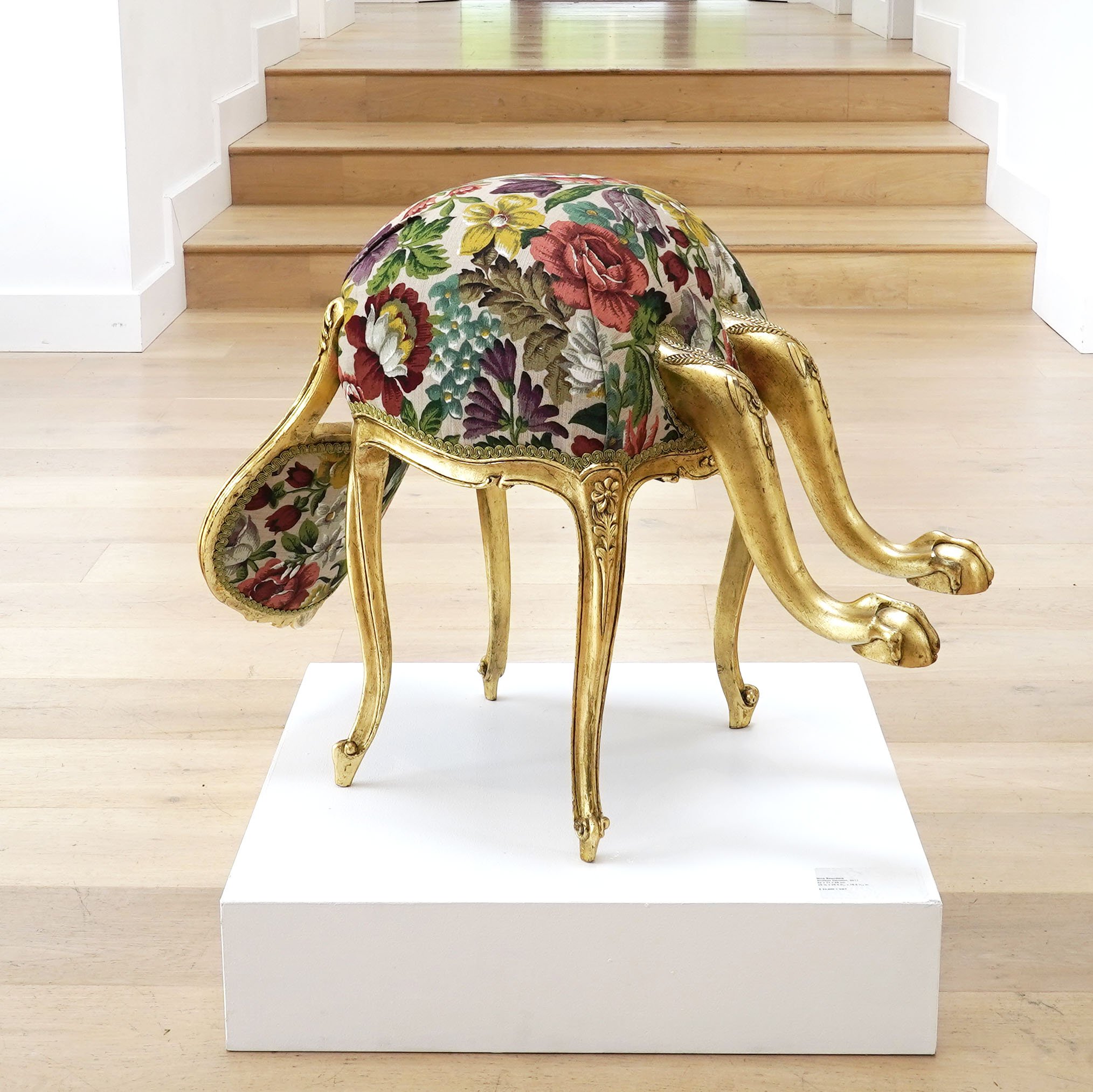 Chair, Sanderson fabric, gold leaf, hand carved wooden legs, upholstery materials