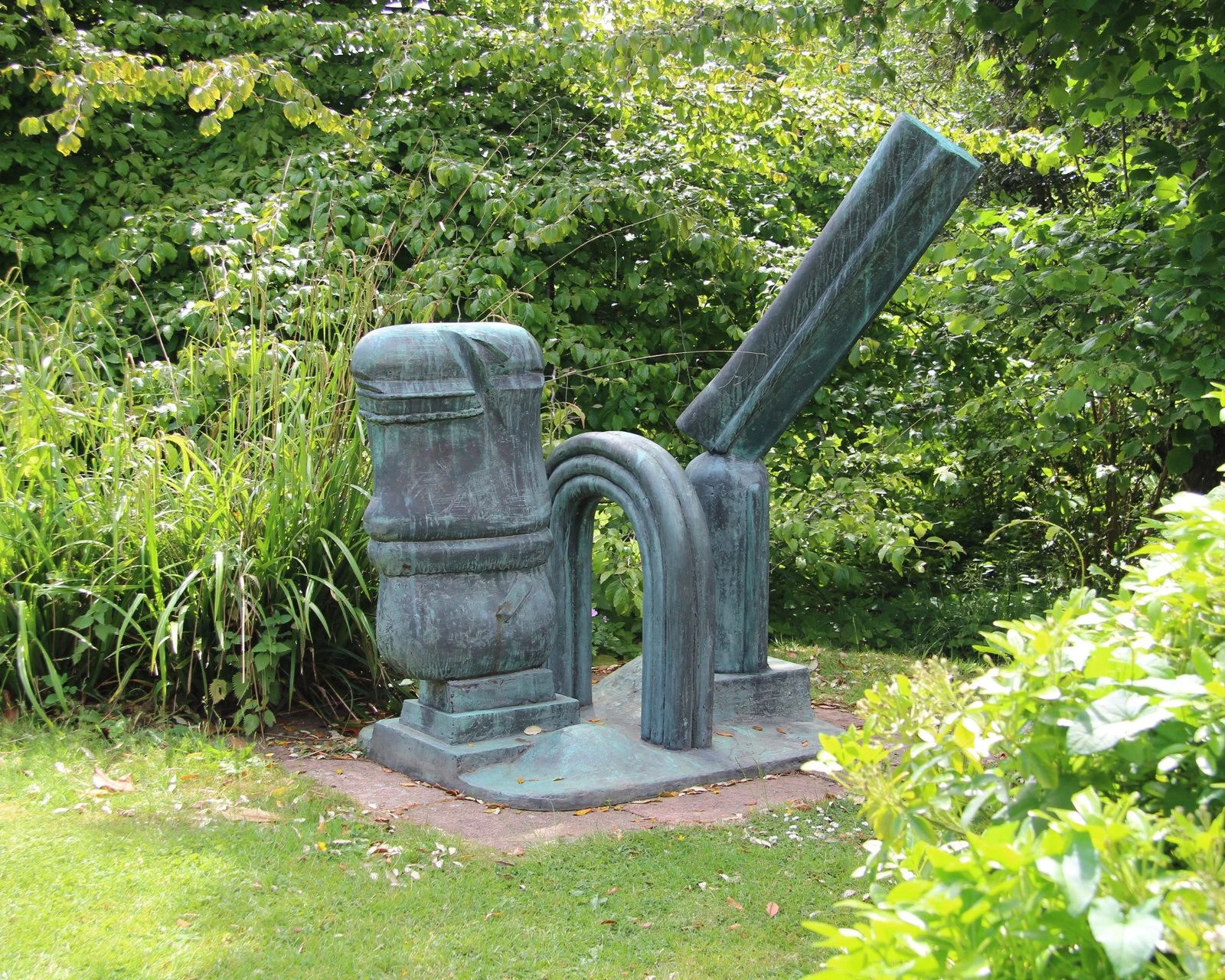 After many decades, the base was removed. The piece is now placed directly on the ground, which highlights the juxtaposition between the natural landscape and Dalwood's characteristic structural forms.