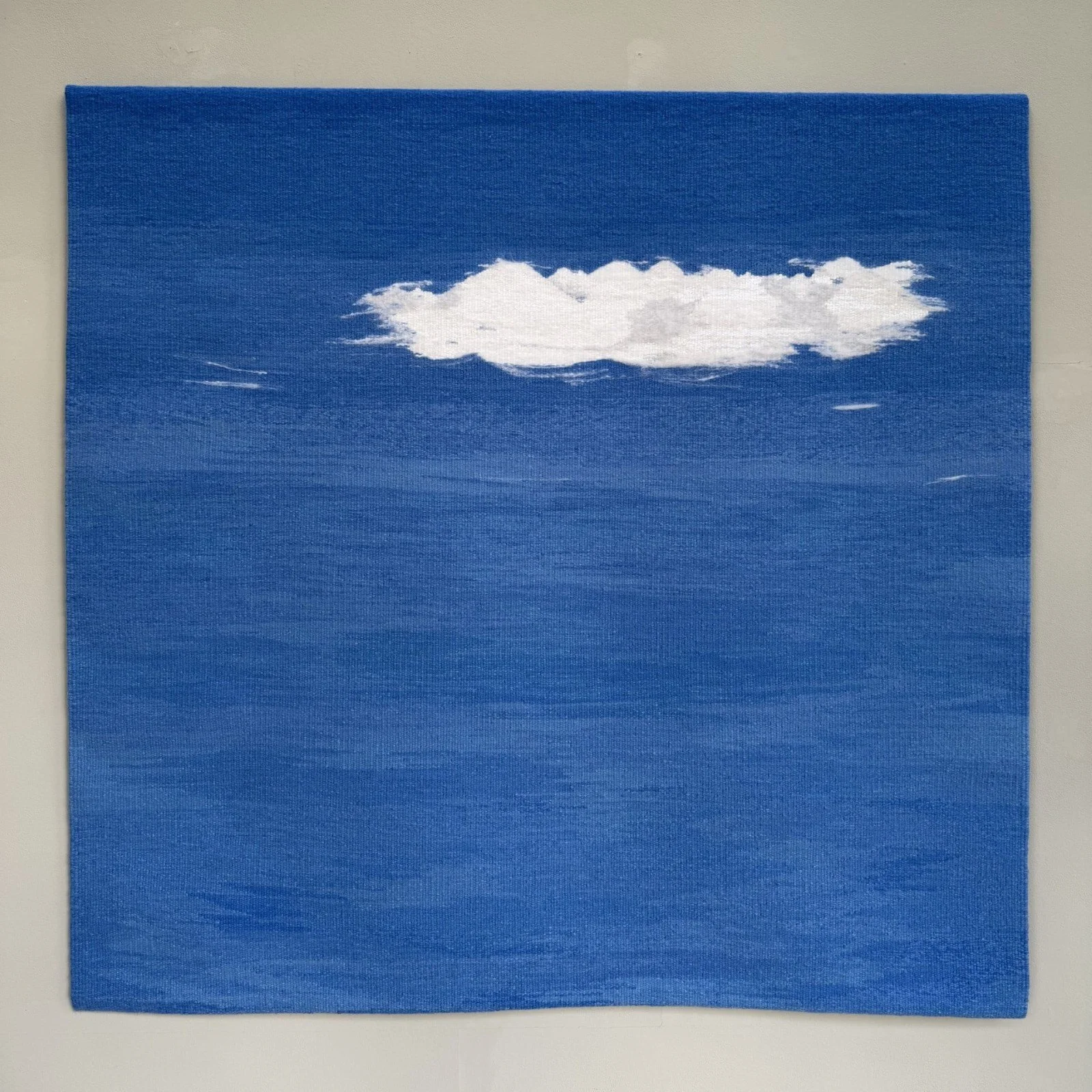 Randall uses British wool in all of her tapestries, yet she experiments with different materials to create dynamic textures. In 7am Early Spring, Randall used silk mohair to portray the fluffiness of clouds, whilst the use of linen provides a harder, shinier edge. Randall explains that 'when you look at clouds, you’ve got that hard edge and then a soft edge.’ Through incorporating a range of materials, Randall's work offers the viewer an immersive experience. Standing in front of this large wall hanging, one is whisked away to a peaceful morning, 'the blue sky promises a good day ahead and promotes feelings of optimism and joy.' (Justine Randall)