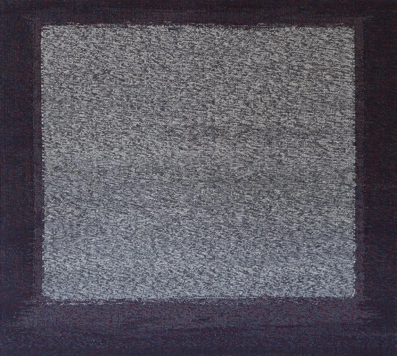 The tapestry 'depicts a window frame with an out of focus centre, like thick fog, a weightless substance where the thoughts of people who can’t sleep or the souls of dead bodies can reach through to the other side.' (Justine Randall)