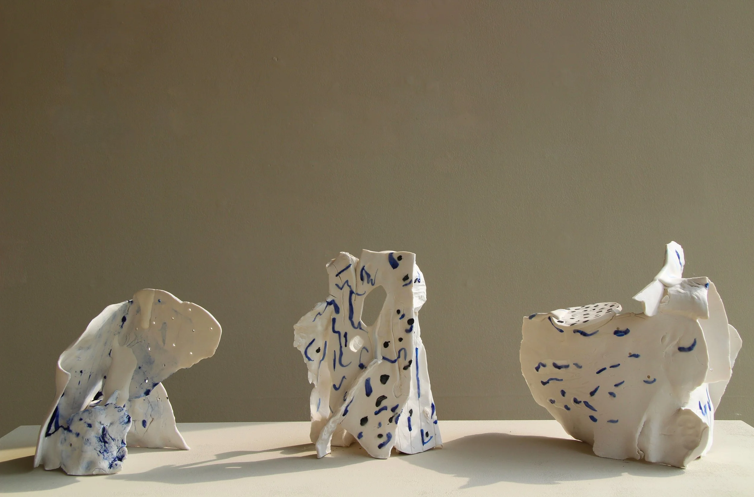 The blue and white colour combination, particularly in ceramics, originated in China in the 9th century AD, however it wasn't until the early 14th century that the mass production of fine, translucent, blue and white porcelain started at Jingdezhen (often referred to as the porcelain capital of China). The European Revivalism of this aesthetic mimicked this colour combination in mediums such as delftware (a tin glazed pottery) and later in ceramics, coming to be known as The Willow Pattern. The European Classical Revival, prominent in the 18th Century and onwards, sought to incorporate classical elements and motifs into art whilst assimilating contemporary methods, features and relevance. Matsunaga has continued this legacy, drawing from the archaic blue and white motif and channelling it through his own method of sculpting.